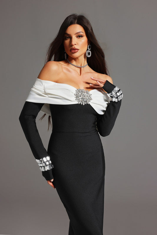 Faith Onyx Omzu Açık Uzun Kollu Taş Detaylı Maksi Elbise