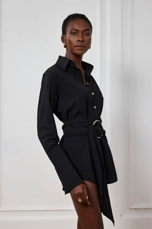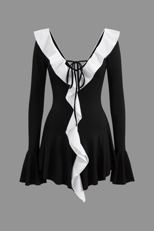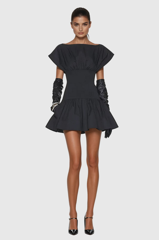Amery Büzgülü Fırfırlı Parçalı Mini Elbise (Siyah)