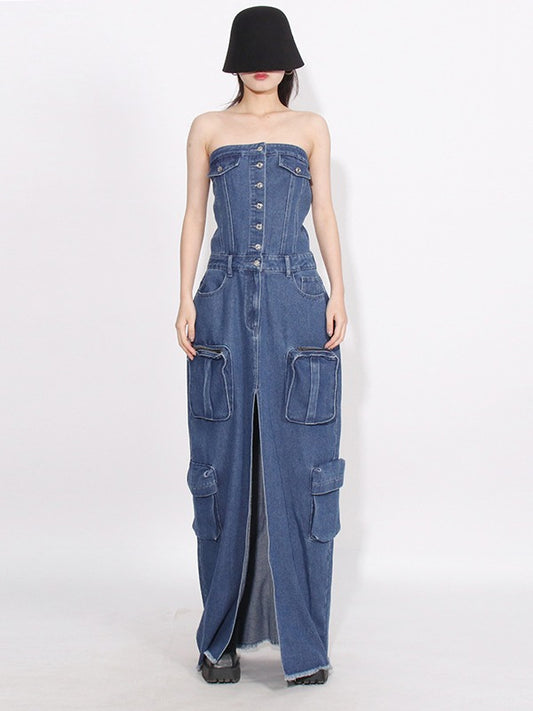 Baldwin Taşlı Kesik Yakalı Kot Mini Elbise