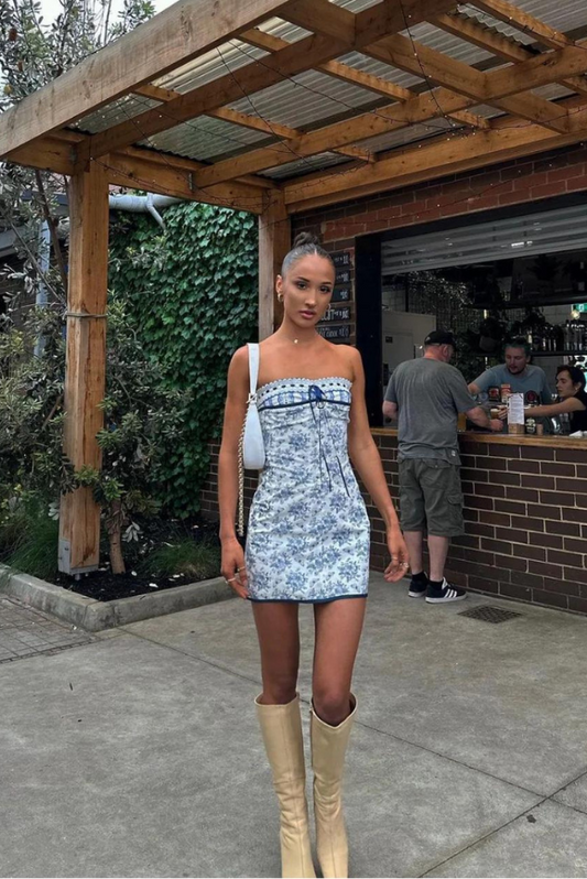 Amaya Mavi Beyaz Çiçek Desenli Mini Elbise