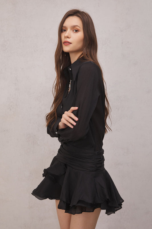 Brinley Ruched Fırfırlı Mini Elbise (Siyah)