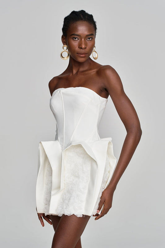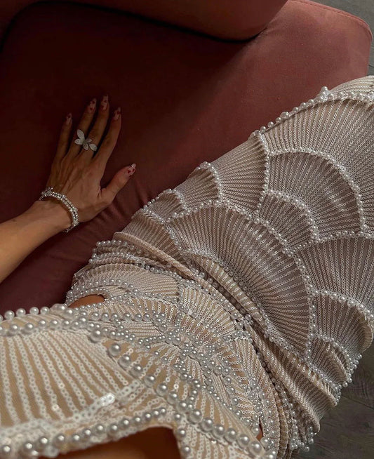 Leona Vintage Krem Boncuklu Straplez Elbise