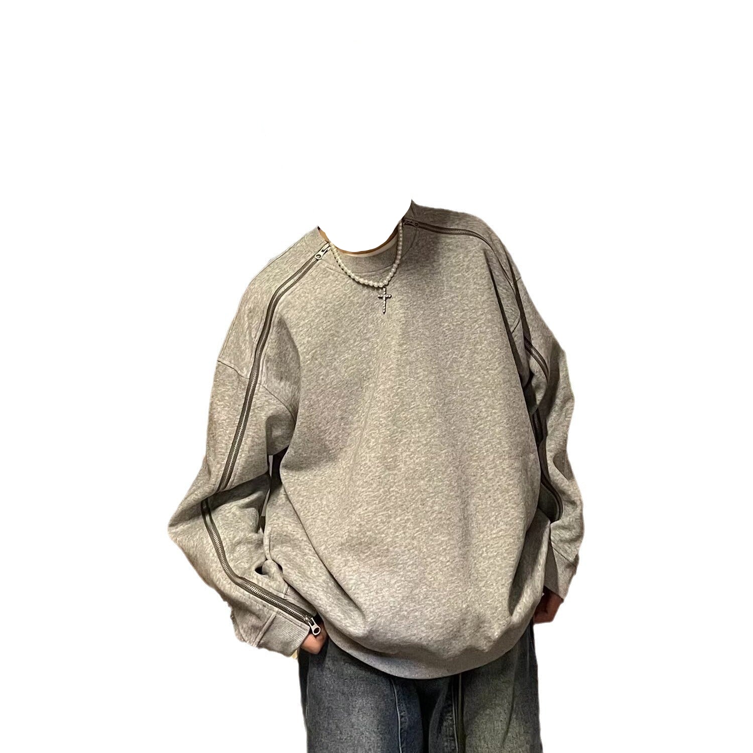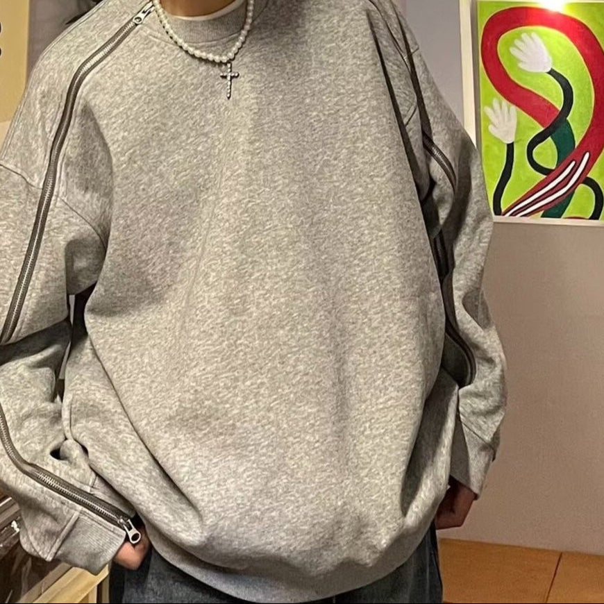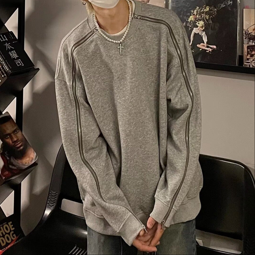 Çift fermuarlı gri yuvarlak yakalı sweatshirt erkek ilkbahar ve sonbahar tarzı niş tasarım ağır kapüşonsuz ceket bol günlük