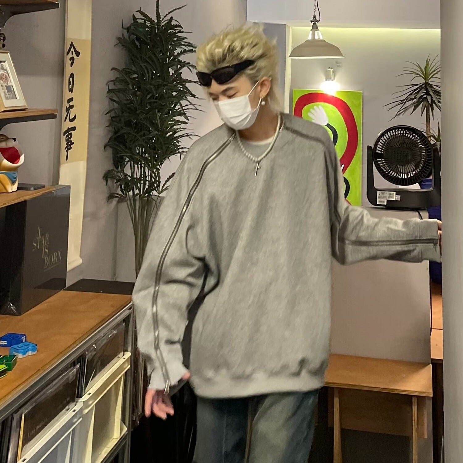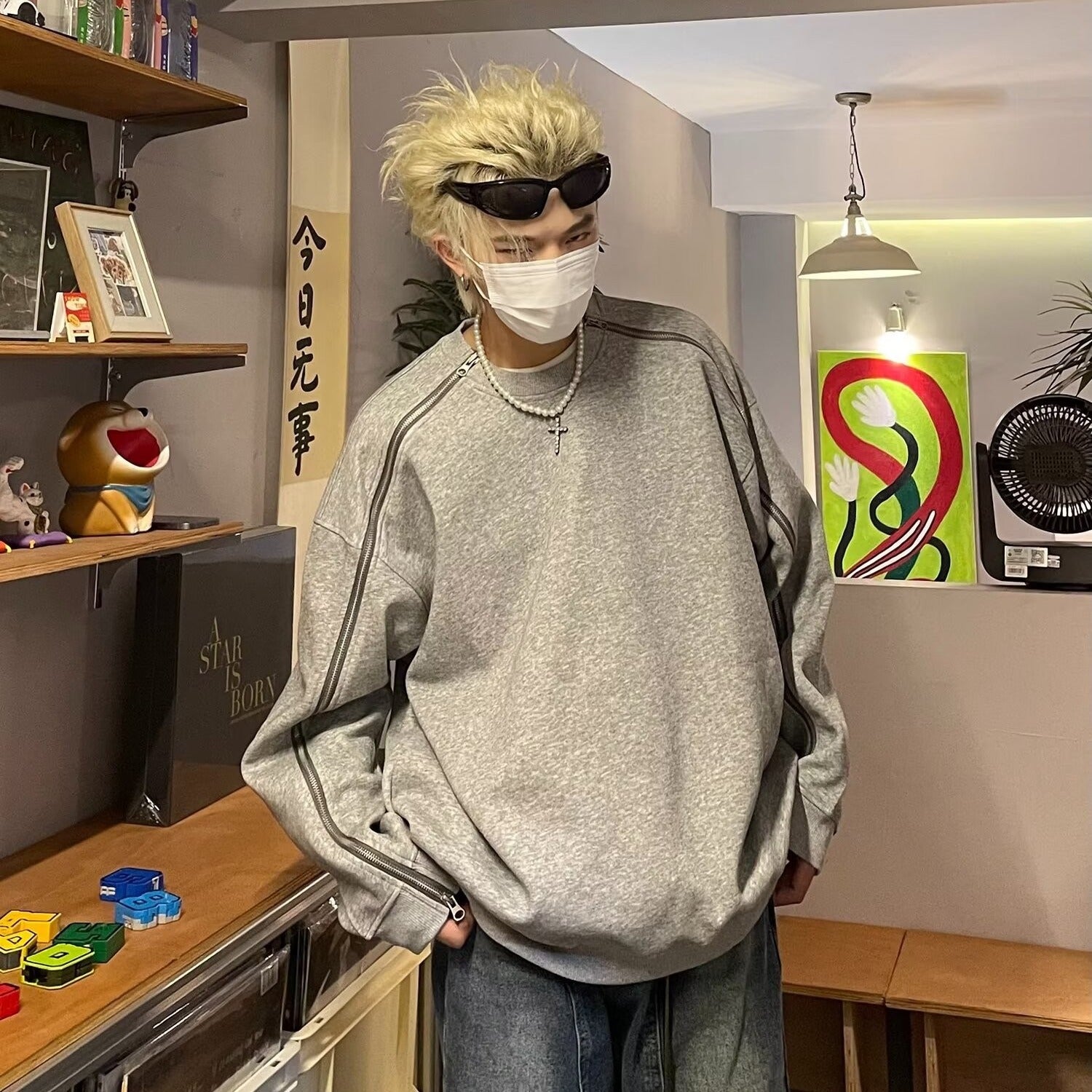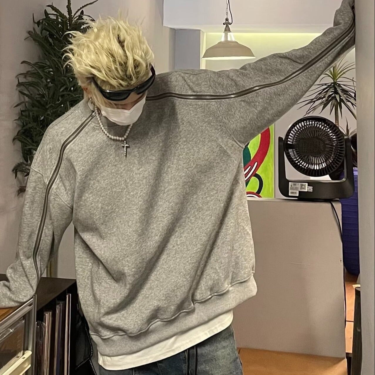 Çift fermuarlı gri yuvarlak yakalı sweatshirt erkek ilkbahar ve sonbahar tarzı niş tasarım ağır kapüşonsuz ceket bol günlük