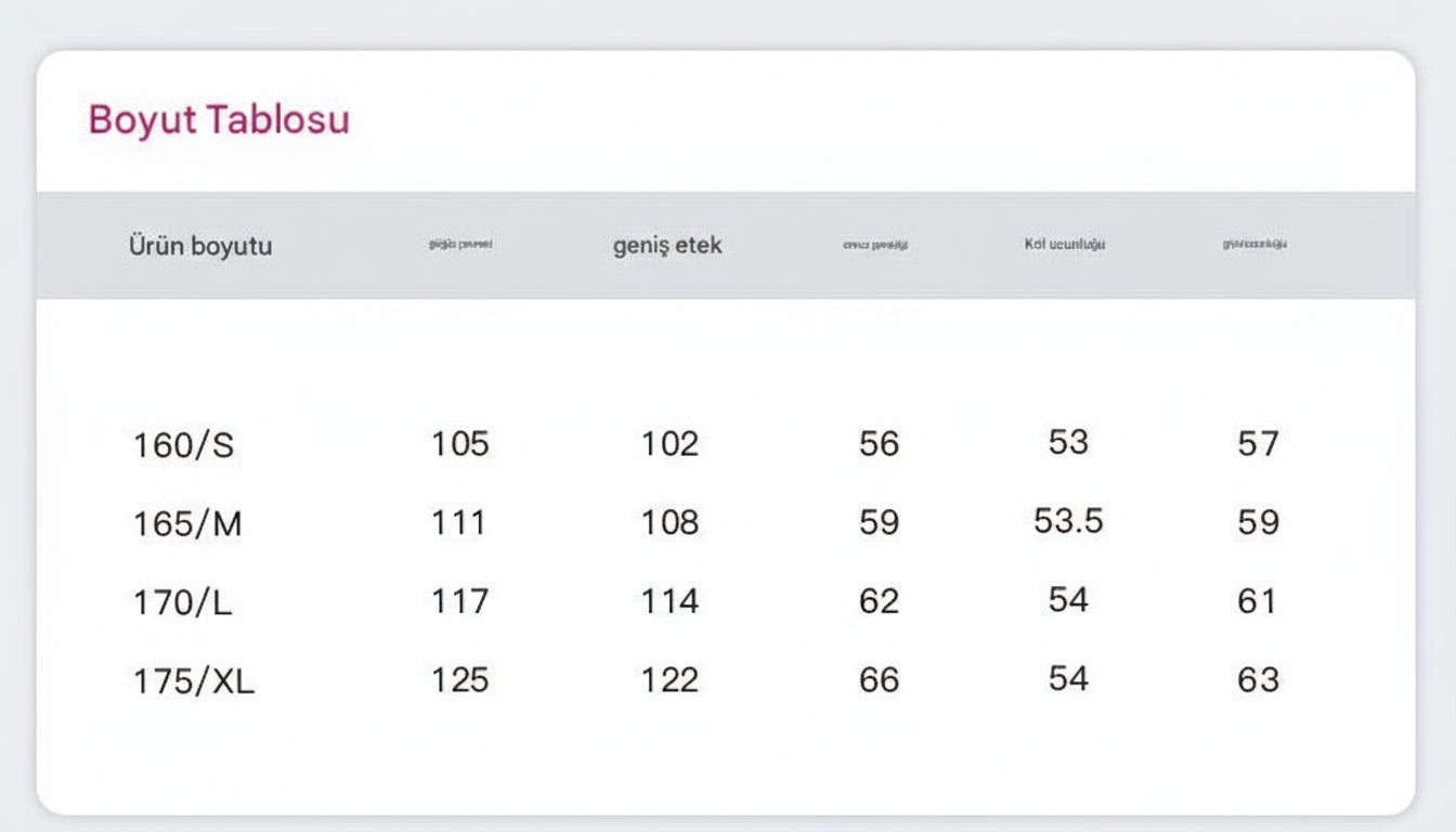 | boyut | Küçük, Orta, Büyük, Büyük |