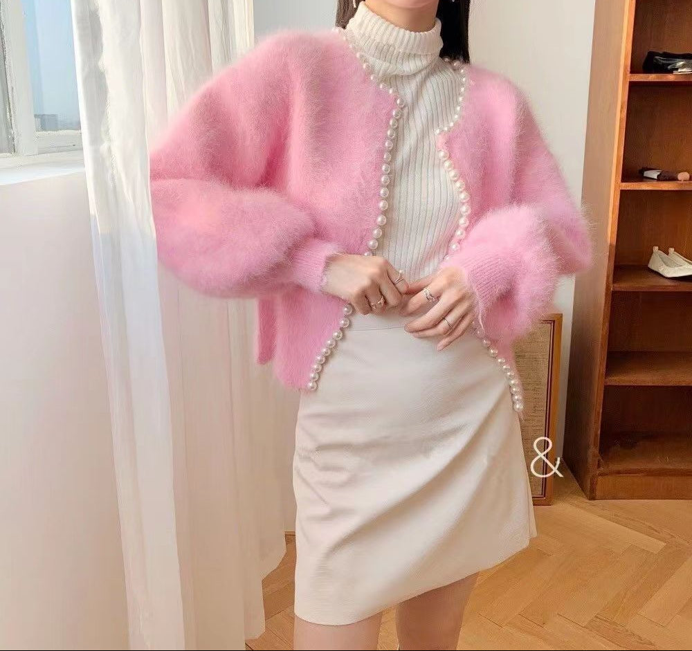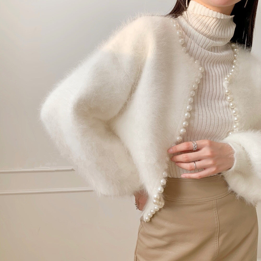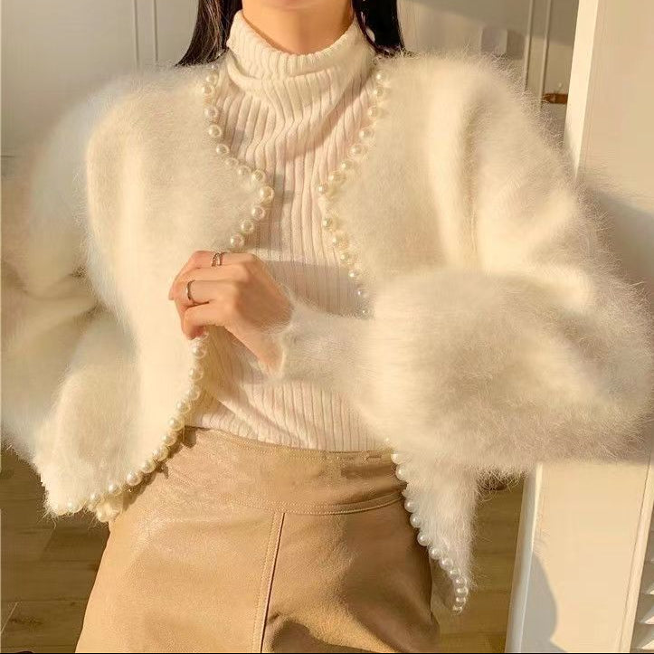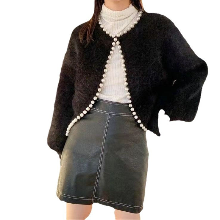 Boncuklu inci kenar kazak örme hırka