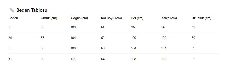 Yapı: Tek parça üst giyim