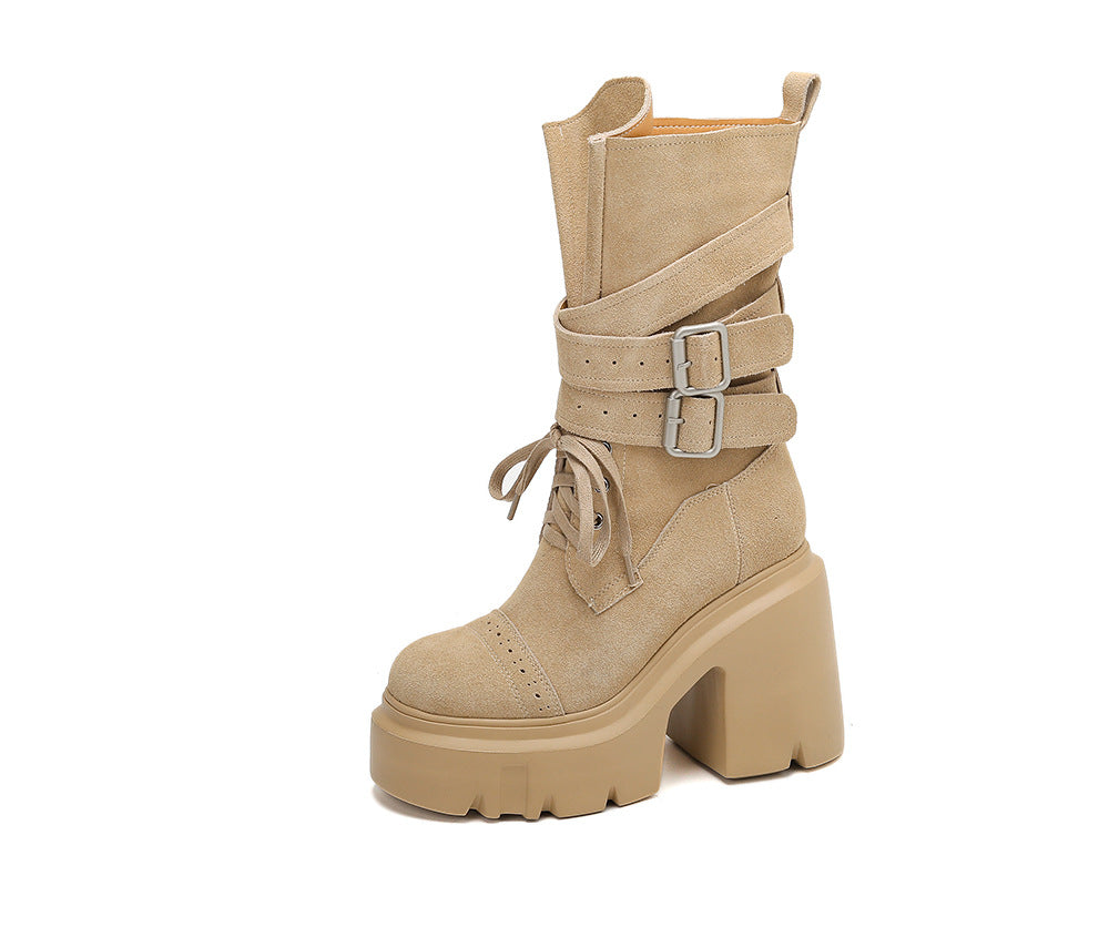 Retro Şövalye Çizmesi – Nubuk Deri, Kalın Topuk, Su Geçirmez Platform